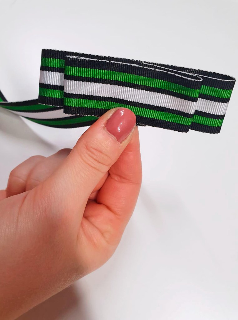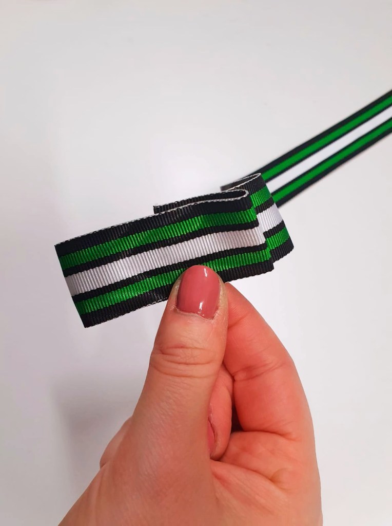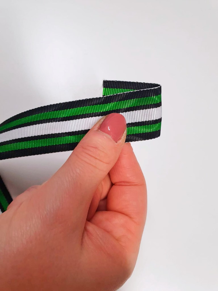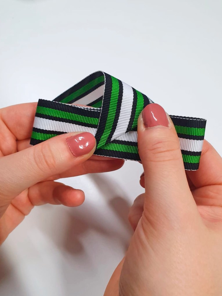 - Viimeisenä käännä nauha takaisin ruusukkeen takapuolelle, leikkaa pois ylimääräinen nauha ja kiinnitä lopuksi nauhan pää ompelemalla.