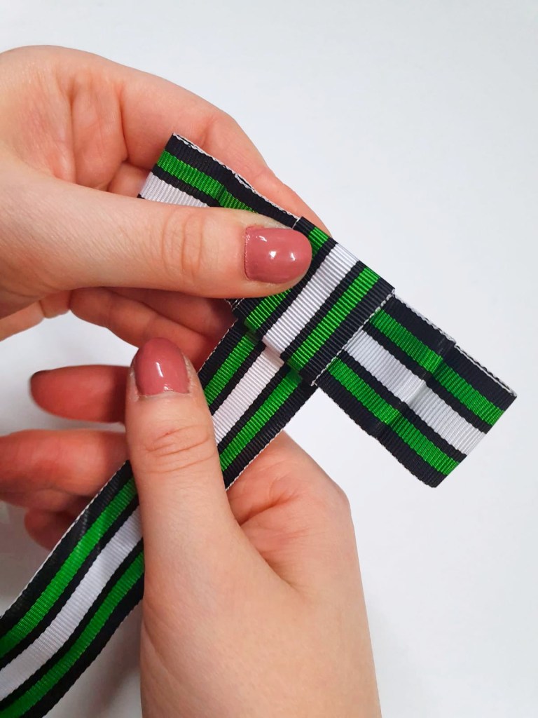 - Nauhan taittelu aloitetaan tekemällä noin 3 cm taitos vasemmalle.